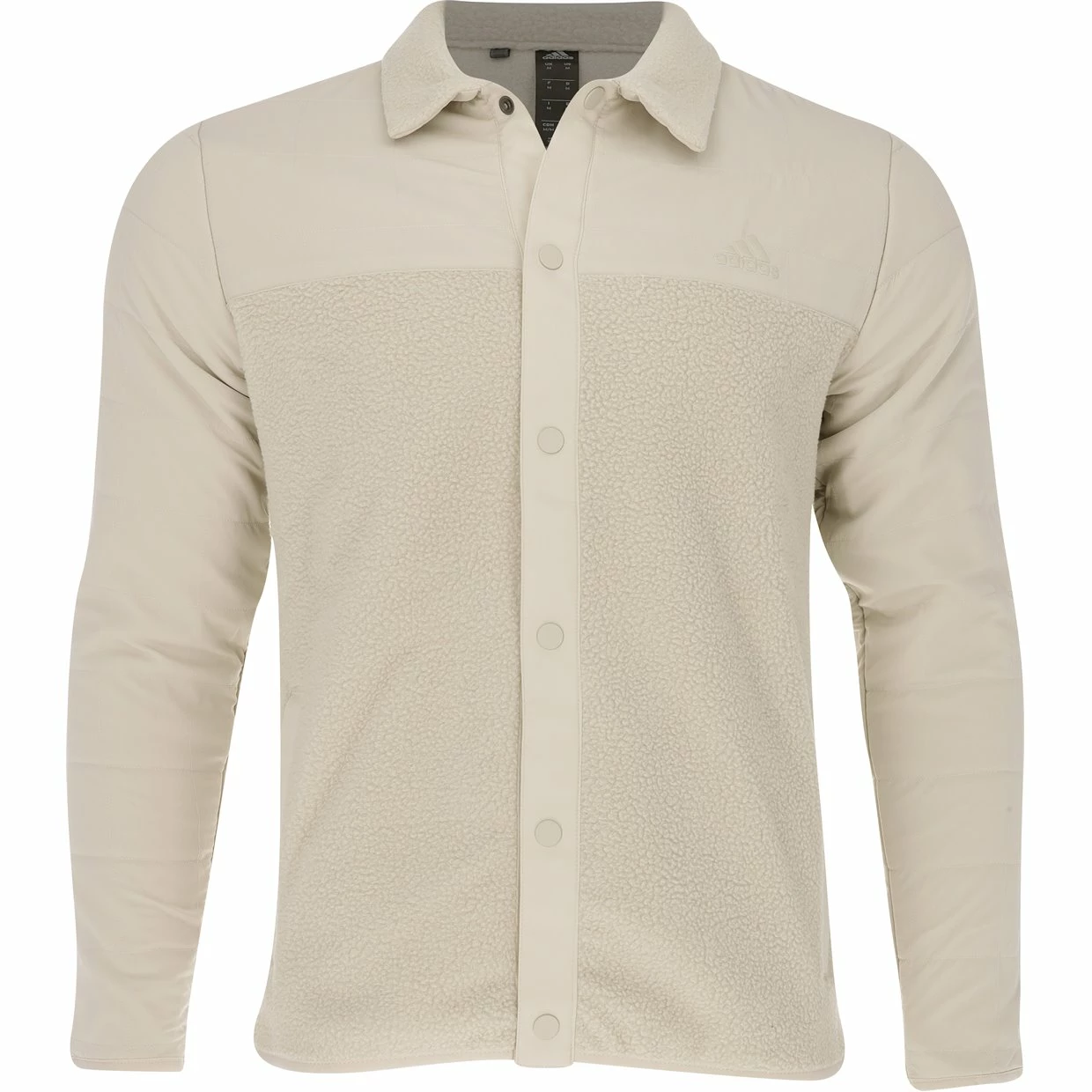 The Adidas Chore Coat features a regular fit, snap-button front with fold down shirt collar, slight droptail hem, front pockets, and elastic sleeve bindings