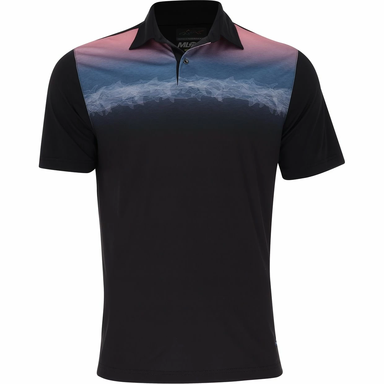 The Men’s Greg Norman Lab Tide Polo features a ML75 technology to keep you dry, cool, and comfortable, a tailored collar, Engineered Shark print patter, and a shark logo on the bottom hem
