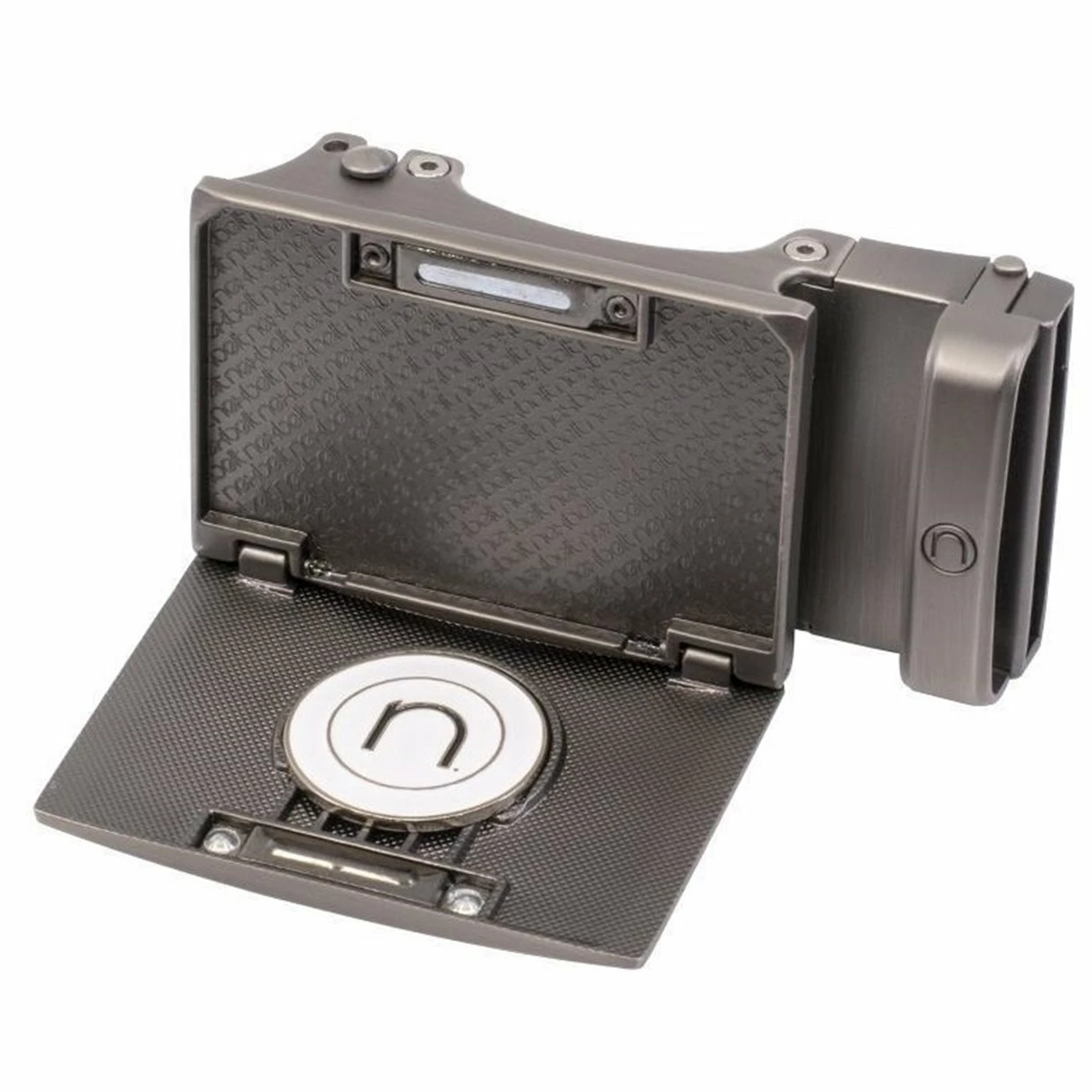 The Nexbelt Go-In Traditions belt is constructed with leather and features matching stitching. The buckle has been updated with beveled edges for a more modern look. It has a matching leather face with a pewter trim and flips down to reveal a hidden 2 sided ball marker. The belt is designed with a sizing system that fits up to 45 inches. Once you find your size, you can cut the belt to customize your fit. The ratchet closure doesn’t require holes. Simply slide the belt strap into the buckle and the integrated teeth strip holds the belt in place.