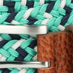 The Pebble Beach Beer Mug Ribbon belt features a ribbon overlay with genuine leather tabs and a sliver finish buckle. 7 point end holes allow for a “Better Fit”